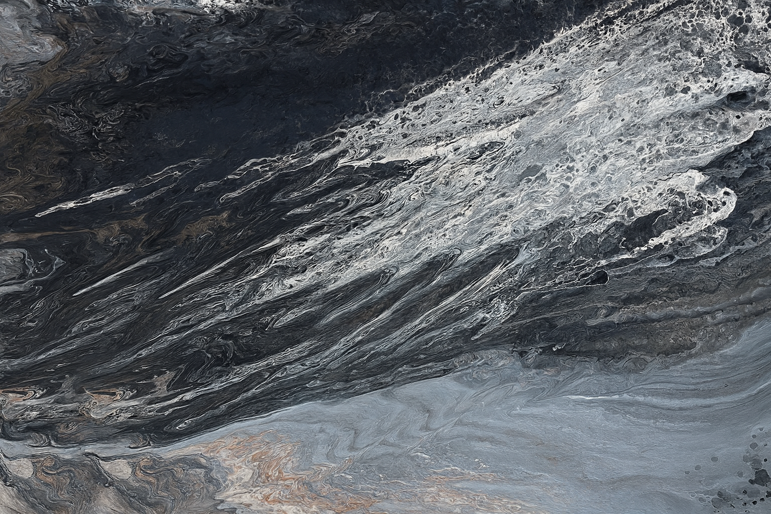 “Dark Forging” captures the moment when natural forces collide — when water, stone, and air blend in a single motion of power and transformation. Waves of charcoal, ash-grey, and steel-blue cascade through the canvas, creating a sense of depth and fluid intensity. The composition feels alive — as if forged in motion, shaped by invisible currents that both destroy and renew.